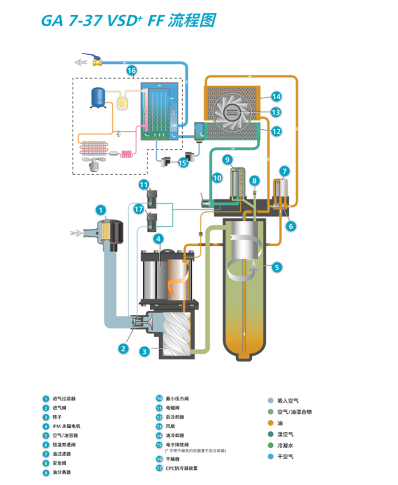 GA FF 全功能機型集成了干燥機和油水分離器,以保護您的壓縮空氣管網。高品質空氣可延長設備的使用壽命、增加效率并確保產品的質量